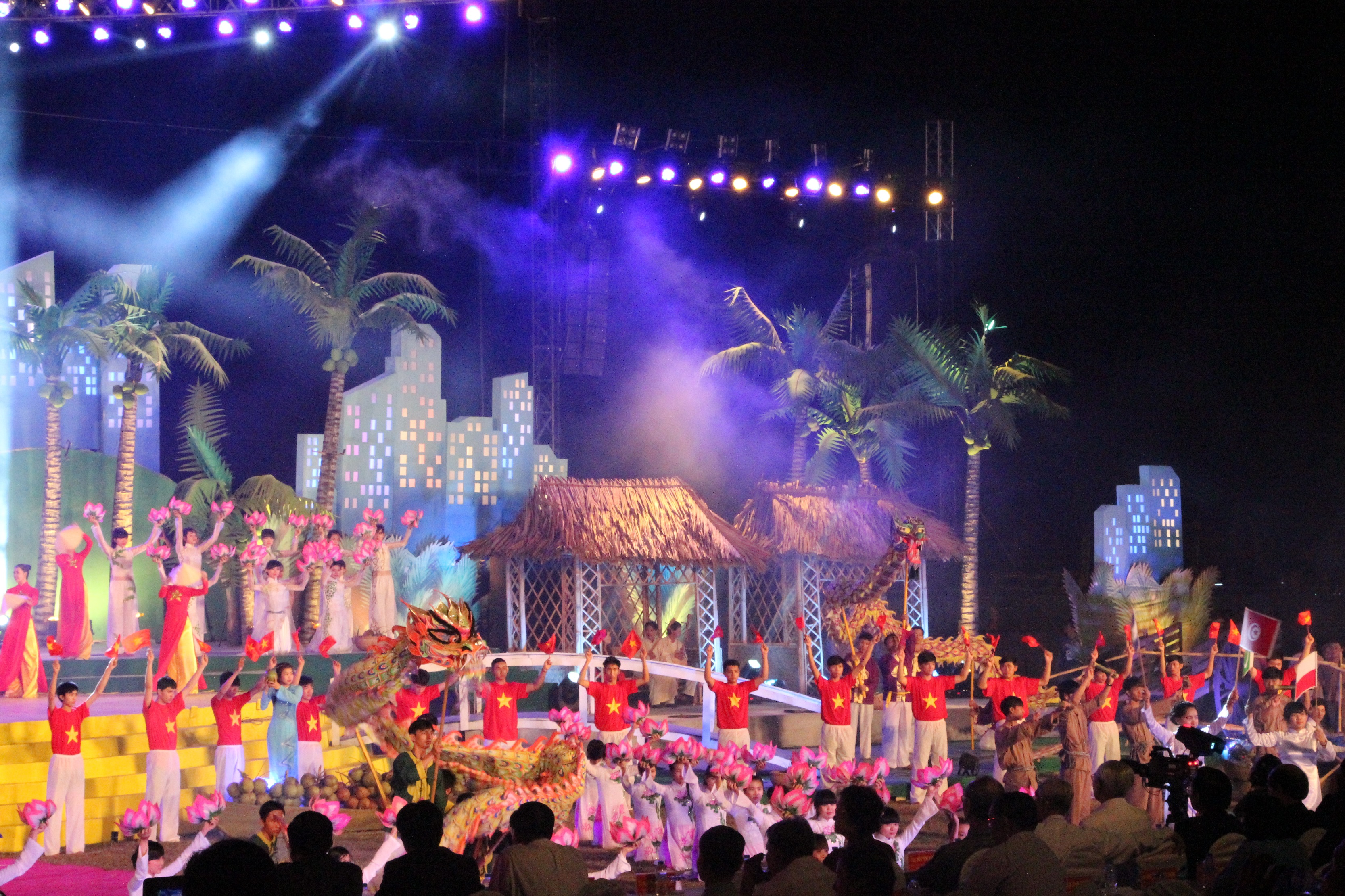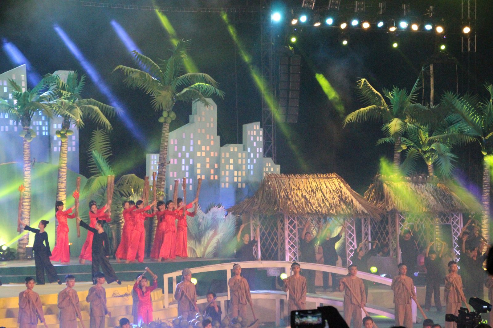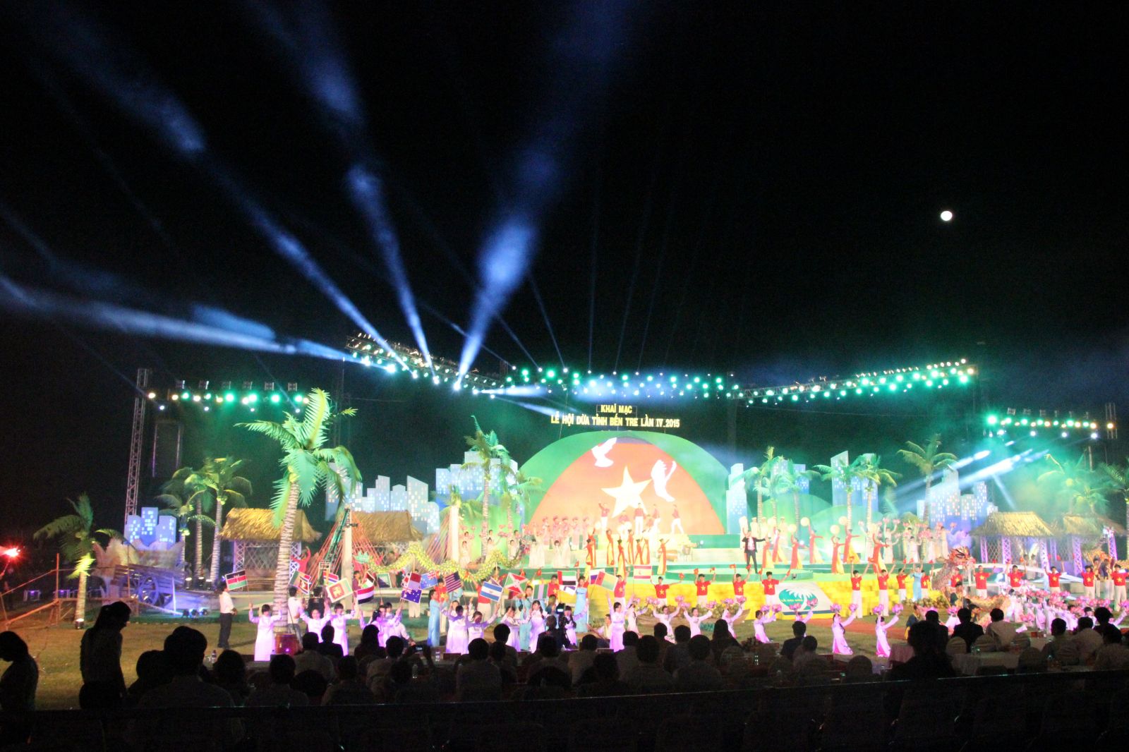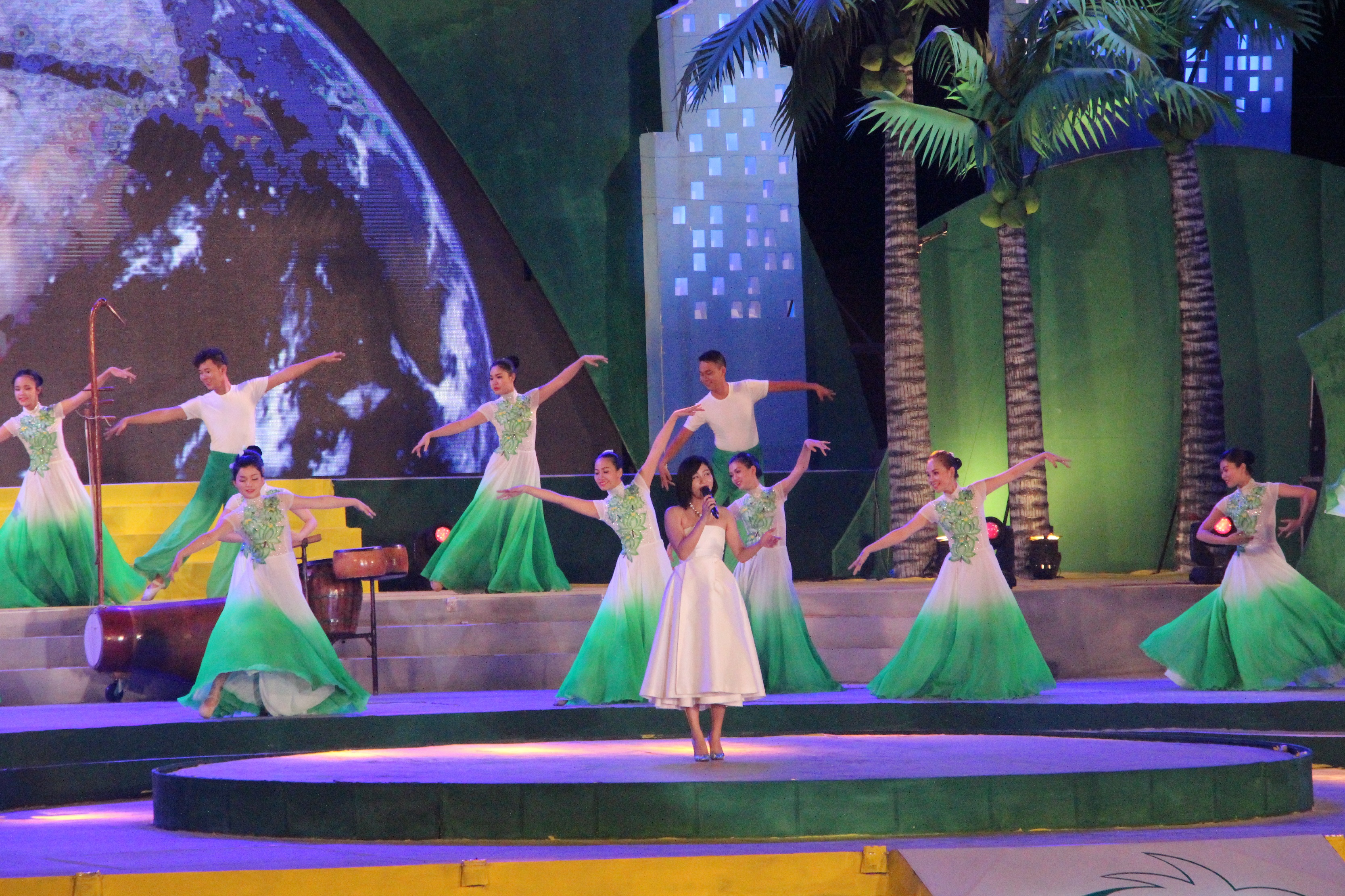 Sân khấu hoành tráng được lấy ý tưởng từ dừa, tái hiện chân thực khung cảnh bạt ngàn dừa xanh của miền đất Bến Tre và hình ảnh sông nước đặc trưng của Miền Tây chân chất. Các chi tiết nhỏ như gian nhà mái lá, cầu tre, xuồng ba lá, … được đầu tư kỹ lưỡng giúp không gian thêm sinh động. Xanh lá được sử dụng làm tone màu chủ đạo, tạo nên hình ảnh xanh mát, tươi mới, đồng thời cũng mang ý nghĩa của sự phát triển, hy vọng theo chủ đề của lễ hội.