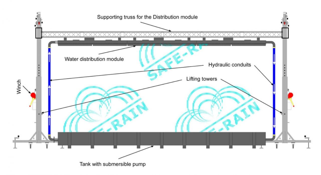 - Thùng chứa nước và máy bơm chìm: Thùng chứa nước bằng thép và một máy bơm có khả năng đảm bảo cung cấp dòng nước với áp lực cần thiết cho module phân phối nước. Trong giới hạn cho phép, nước được phun ra càng mạnh thì độ phân giải của các ký tự càng cao. Và để xử lý vấn đề áp lực nước, một bảng điện tử được trang bị với một bộ biến tần dùng để điều khiển máy bơm. Qua đó, lưu lượng dòng chảy được điều chỉnh một cách dễ dàng, từ đó các ký tự cũng sẽ được tạo ra một cách rõ ràng nhất.